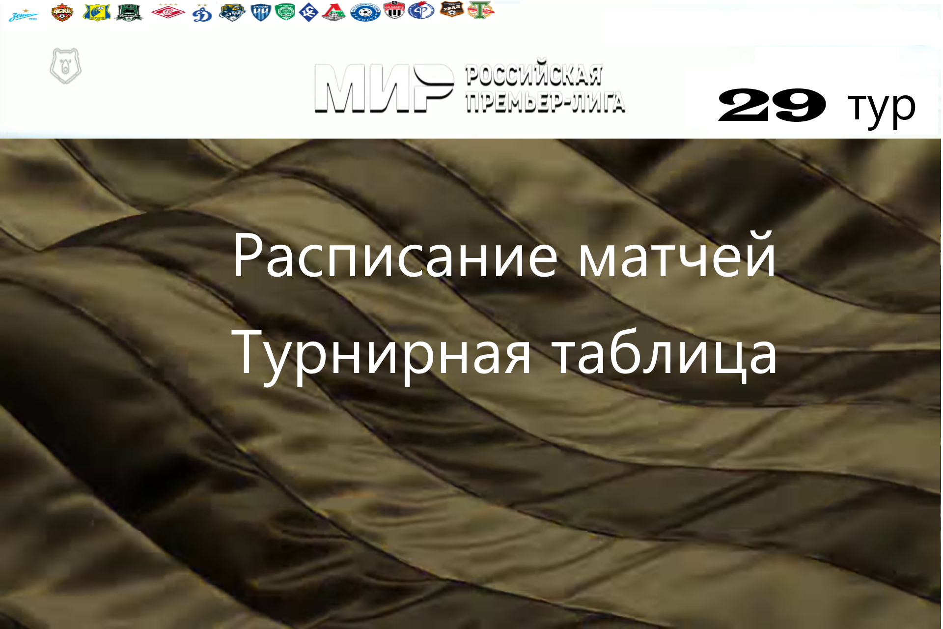 Приветствуем всех любителей спорта ! Представляем вашему вниманию расписание футбольных матчей 29 тура «Российской Премьер Лиги». Так же можно ознакомится с турнирной таблицей команд высшего дивизиона на данный момент и увидеть итоговые результаты матчей 28 тура. Всем удачи и увлекательных просмотров.